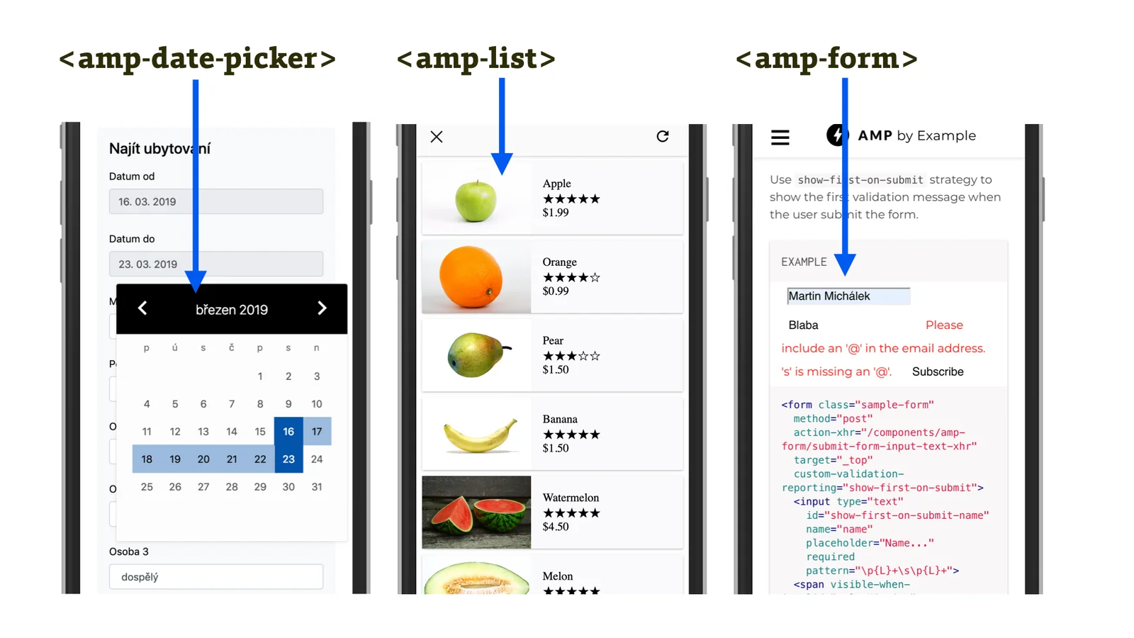 amp-date-picker– velice robustní (a dle našeho názoru z uživatelského hlediska hezky udělaná) komponenta pro vkládání data nebo rozsahu dat. Obdoba takto zaměřených pluginů pro jQuery nebo třeba React.amp-form– vložení formuláře, který je možné validovat a odesílat na straně prohlížeče. Obsahuje také polyfilly pro chybějící vlastnosti prohlížečů, týkající se validace obsahu uživatelských vstupů. Důležitá je možnost odeslání AJAXem pomocí atributuaction-xhr.amp-geo– řekne vám, v jaké zemi se uživatel právě nachází.amp-list– seznam položek aktualizovaný přes data stahovaná z vašeho serveru. Skvělé pro jakékoliv seznamy, které se mění v čase, nebo pro uživatele – aktuální ceny nebo třeba personalizovaný seznam podobných článků.amp-live-list– opět seznam položek, jen tentokrát aktualizovaný v reálném čase. Vhodné například pro živé přenosy.amp-mustache– silná komponenta pro zobrazování obsahu pomocí šablon Mustache.amp-next-page– experimentální komponenta pro načtení dalšího obsahu. Je to podobné jako „nekonečné“ rolování stránky, ale nový obsah umožňuje načíst jen tři dokumenty do stránky.amp-selector– možnost vložení vlastního výběru.