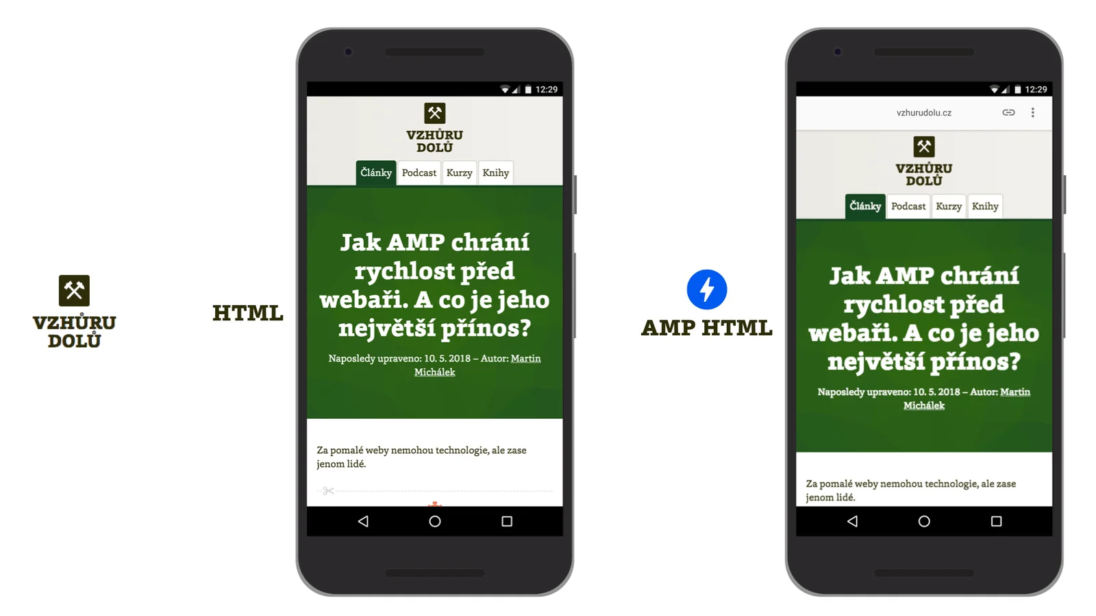 Některé z e-shopů, které mají alespoň částečnou AMP verzi. Prostředky ze strany AMP tady jsou. Dave Besbris na AMP Conf 2018 prohlásil, že přes 60 % stránek vyrobených touto technologií odkazovaných z výsledků vyhledávání Googlu nejsou zpravodajské weby. youtu.be/TX3sFXHwXjo Dynamické komponenty AMP dnes umí naprostou většinu věcí, které běžné weby potřebují: stažení dat z externího API, interakce na stránce, živé přenosy zpráv… S AMPem dnes experimentuje také řada českých e-shopů, včetně například Alzy. 7) „AMP je jenom pro mobily“Také to „Mobile“ v názvu technologie zní jednoznačně, že? Jenže limitování technologie na mobily by popíralo aktuální stav věcí. Vždyť v AMP se dají tvořit celé responzivní weby a my vám to v textech ještě ke všemu doporučujeme. AMP je však zamýšleno jako „mobile first“. Odcitujme Paula Bakause, jednoho z propagátorů technologie: „Podstata AMP není omezená na mobily. AMP je navrženo tak, aby bylo přívětivé pro mobilní zařízení s pomalým hardwarem a internetovými připojeními. Zvýšení výkonu, které s AMP získáte u smartphonů, bude mnohem větší než u počítačů. AMP však není mobilní – je ,mobile first‘.“ Více informací je v textu „About that ‘mobile’ in Accelerated Mobile Pages“. vrdl.in/ampmobile Buďme ale féroví – plné výhody distribuce v AMP Cache a přednačtení ocení zatím opravdu jen mobilní uživatelé. 8) „AMP omezuje grafickou kreativitu a stránky jsou si navzájem velmi podobné”Ve srovnání s běžným webem jsou tvůrci skutečně limitováni. Musejí využívat karusely, lightboxy, navigace a další komponenty pouze z nabídky AMP. Na lákavé jQuery pluginy prostě tentokrát musejí zapomenout. Velikost CSS je omezená na 75 kilobajtů, JavaScript je silně omezený. Limitace to je, ale nelze říct, že by zabíjela kreativitu. K dispozici zde máme všechny podstatné příměsi grafického designu. Nový je zde výraznější tlak na to, aby se designéři, designérky, grafici a grafičky naučili framework a jeho omezení. Možná si říkáte, že to už tady bylo například s frameworkem Bootstrap. Z naší zkušenosti se ale často na omezení ze strany vizuálních tvůrců (a často ani vývojářů a vývojářek) moc ohledy nebraly. Jenže AMP stránka je buď validní, nebo ne. V druhém případě nedostane benefity symbolizované ikonou blesku. Proto je zde tlak na dodržení možností frameworku daleko silnější. Může se zdát, že některé AMP stránky jsou si podobné. Obvykle je to využitím pluginů do redakčních systémů, konkrétně nejčastěji původní verze pluginu pro WordPress, které umožňují rychlé vytvoření AMP verzí stránek pouhým zmáčknutím tlačítka. Výstupní šablony je často možné si jen barevně upravit, jinak jsou jedna druhé podobné. Tento způsob tvorby AMP obsahu ale obecně nepovažujeme za šťastný, protože vede k uživatelskému prožitku odlišnému od původního webu. 9) Centralizovaná distribuce a umístění stránek na google.comAMP stránky používají jednotné knihovny servírované z jednoho místa. I tohle mnozí kritizují: