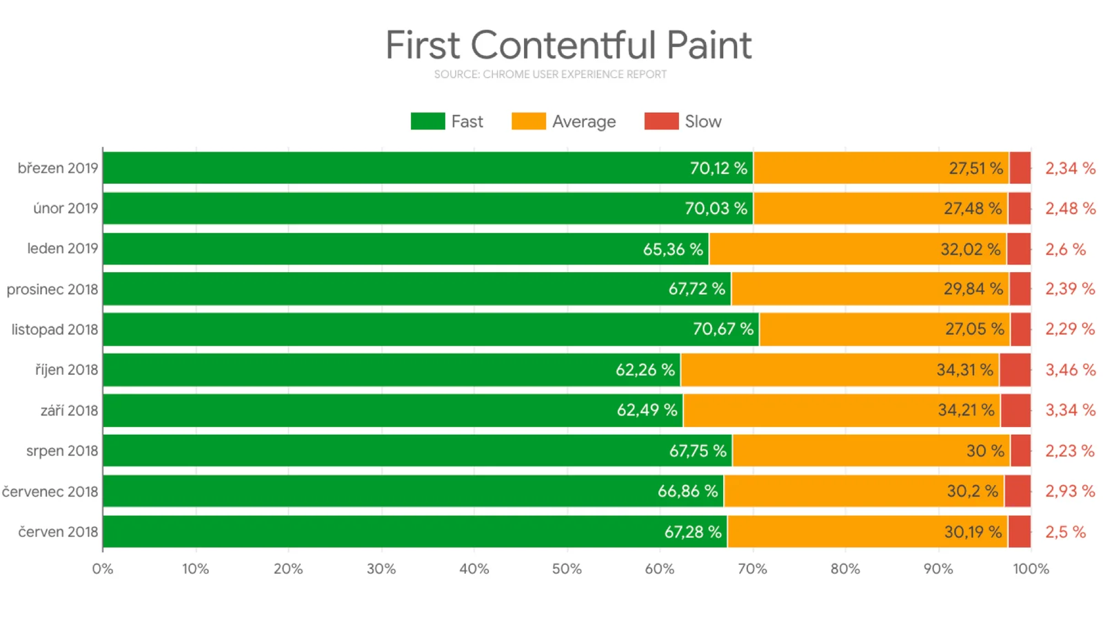 První vykreslení obsahu je u skutečných uživatelů na Vzhůru dolů slušné. Google by si mohl začít myslet, že jde o rychlý web. Co když tu rychlost ale z minuty na minutu pokazíme? Zdroj: Chrome UX Report Dashboard.