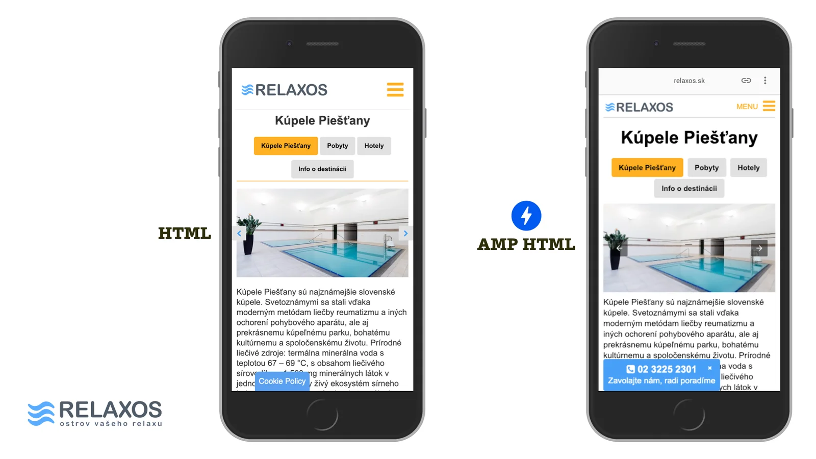 Velmi podobné, ale stále ne totožné pojetí HTML a AMP HTML varianty na Relaxos.sk.