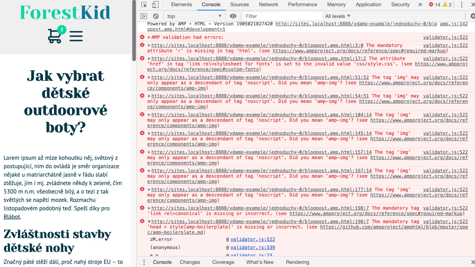 Pokud máte rozšíření v prohlížeči, ihned vidíte, že AMP opět není validní. Není se třeba obávat, potřeba úprav není velká.