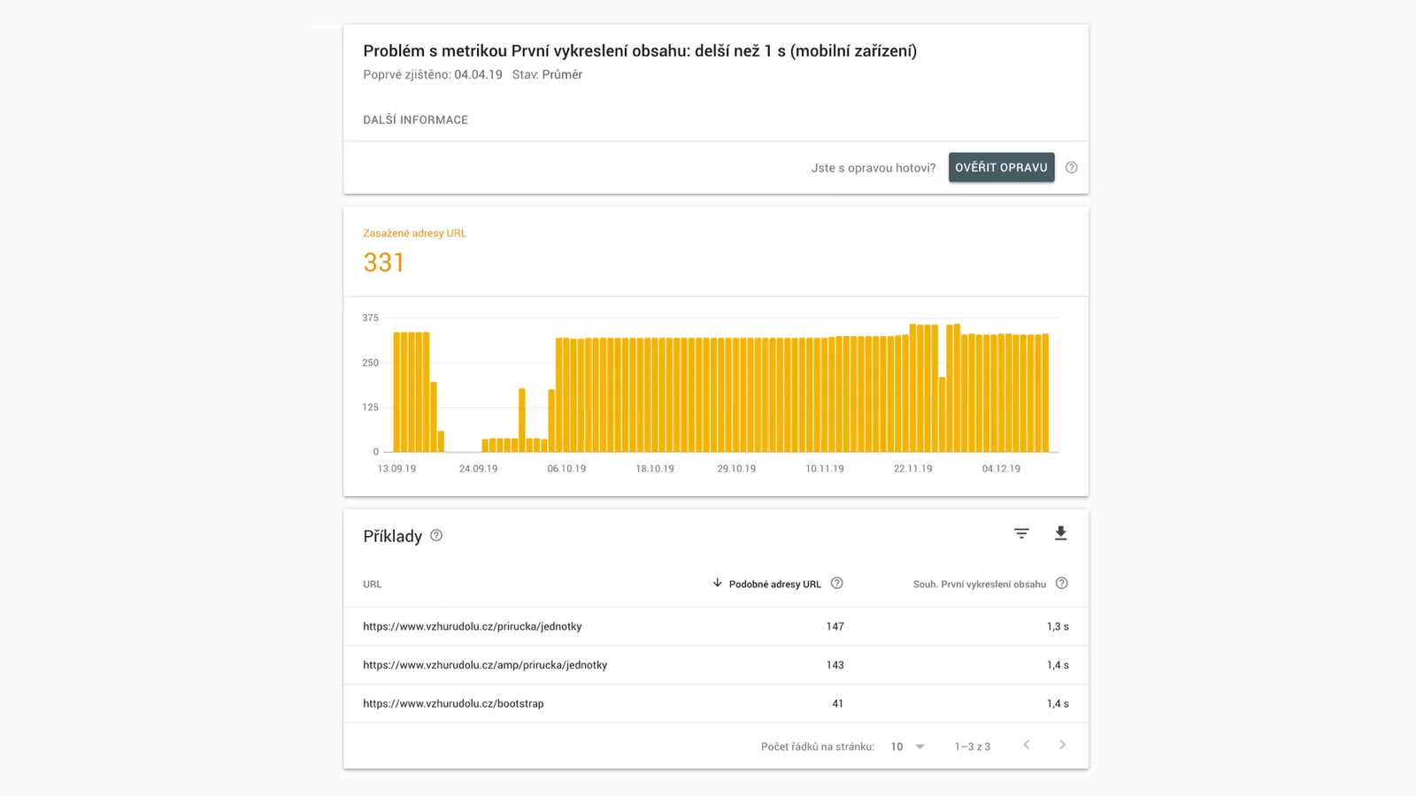 - V reportu se proklikáte až na seznam pomalých nebo průměrných URL adres webu (např. „Otevřít přehled“ > „Pomalu“ > „Podrobnosti“).