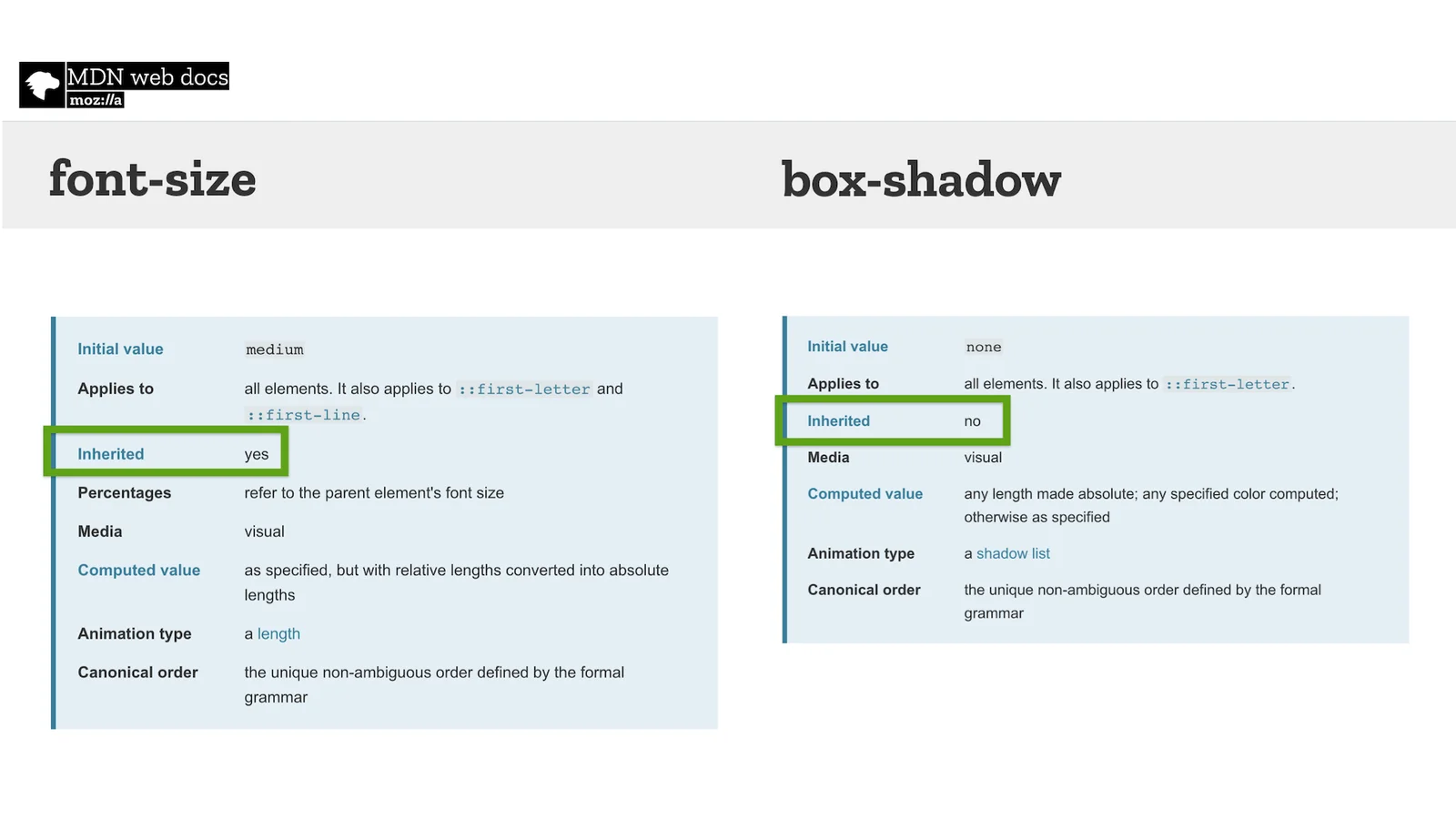 Obrázek: V dokumentaci na developer.mozilla.org nebo ve specifikaci CSS lze najít, zda se hledaná CSS vlastnost dědí a jaká je její výchozí hodnota.