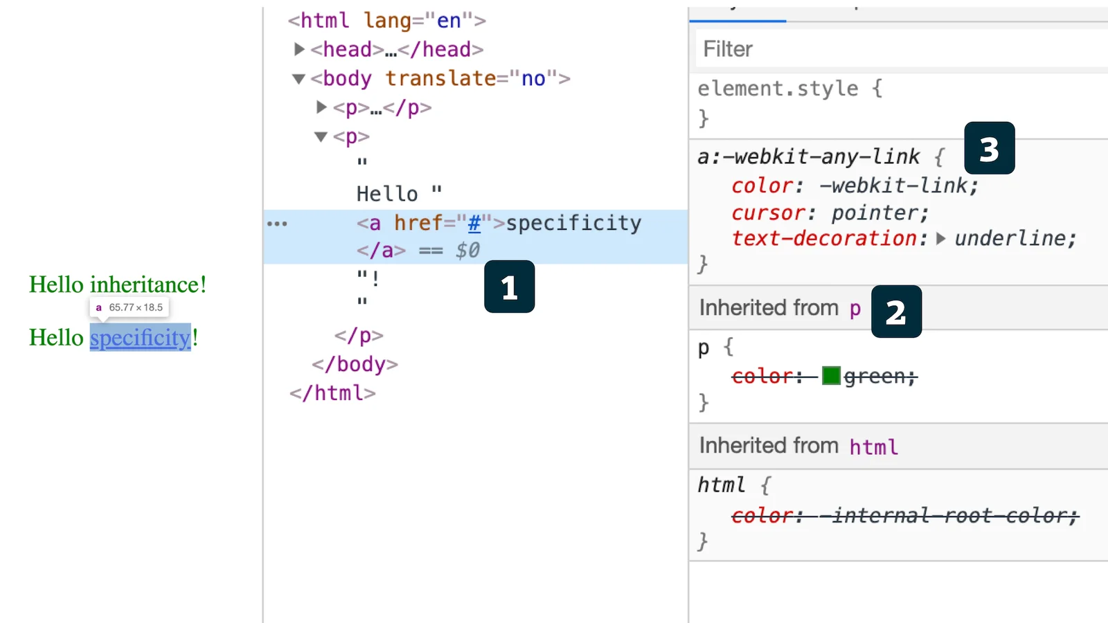 Obrázek: Vybraný prvek [1] sice zdědí barvu od rodičovského prvku [2], jenže vyhraje to selektor definovaný v kaskádě [3].