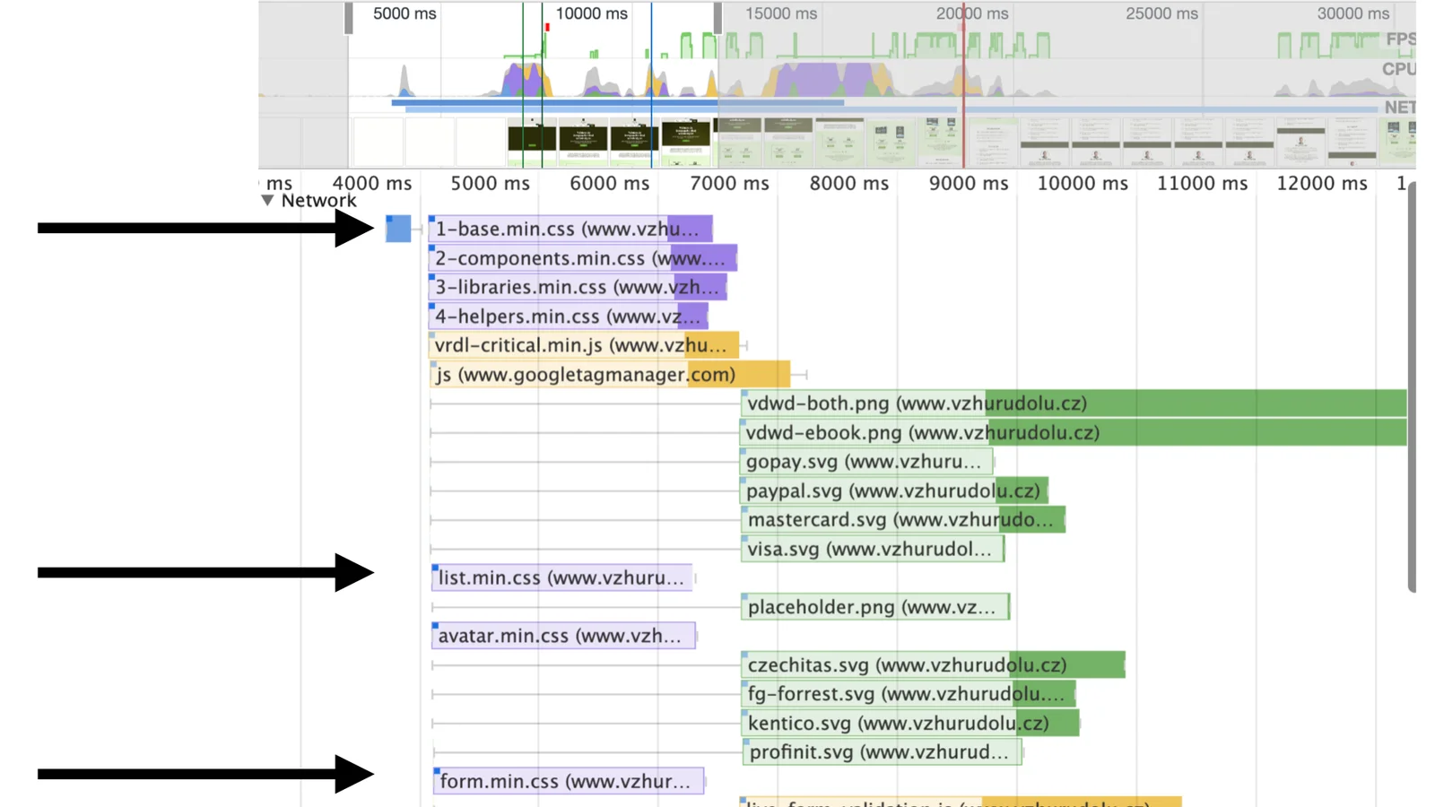 Za normálních okolností by prohlížeč stáhl všechna CSS a pak teprve začal uvažovat o zbytku zdrojů stránky. Tady ovšem stáhne zdroje obsažené v hlavičce (<head>) a následně také obrázky vložené ve stránce nahoře. Až pak stahuje CSS pro jednotlivé komponenty v <body>. Dostanou tedy přednost prvky umístěné v horní částí obrazovky, což je přesně to co chceme.