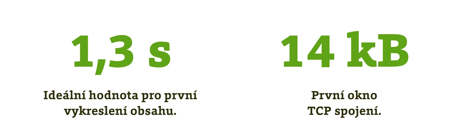 Pokud bychom chtěli být ještě přísnější, měli bychom se vejít do prvního okna na TCP spojení (TCP Initial Window), což je první balíček dat, který putuje ze serveru na prohlížeč a je tedy nejrychlejší. To by znamenalo stahovat v HTML a CSS jen 14 kB dat.