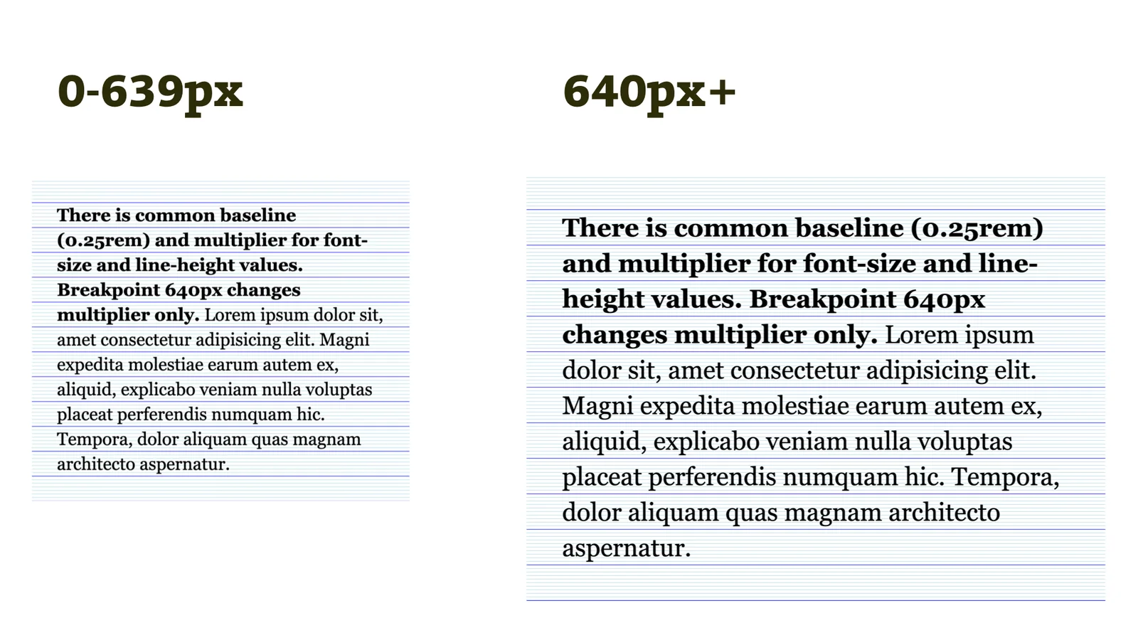 Žádné trapné přepočítávání rozměrů všech typografických elementů pro tento daný breakpoint. Udělá se to „samo“. Změnou --baseline-multiplier se přepočte --line-height a z ní se přepočte --font-size. Vše stále pasuje do čtyřpixelové typografické mřížky.