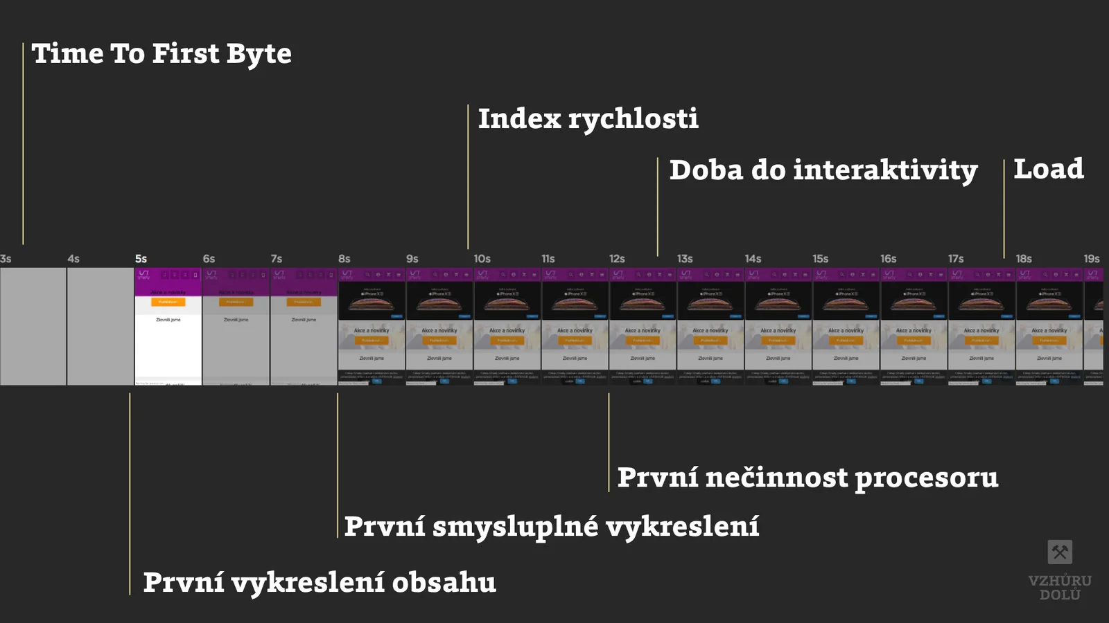 First Paint (FP, První vykreslení), First Meaningful Paint (FMP, První smysluplné vykreslení), Load, Stažení všeho, Time to Interactive (TTI, První možnost interaktivity).