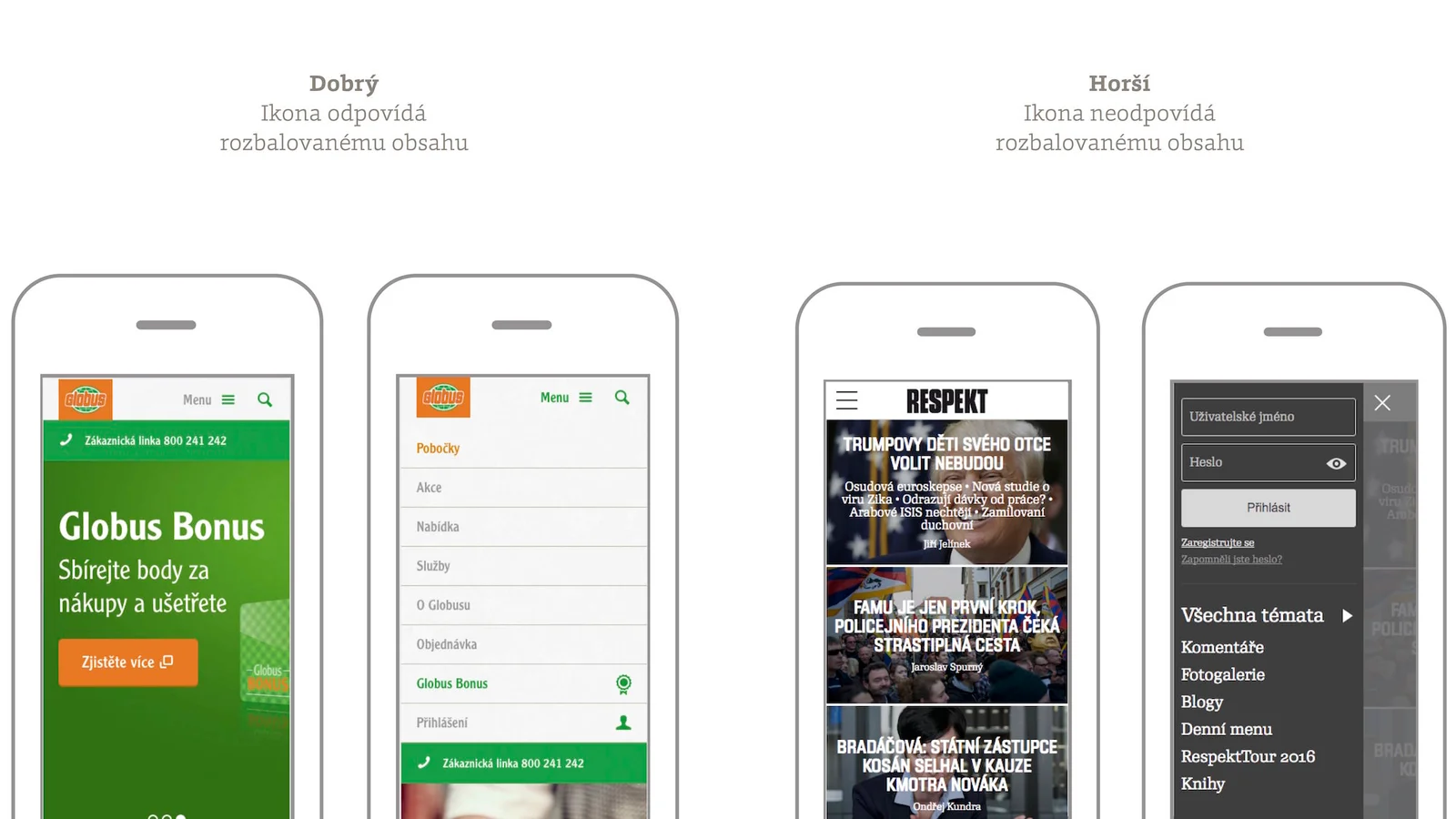 Bylo by lepší, kdyby „hamburger“ vždy otevíral totéž, tedy seznam položek. Bohatší obsah, jaký otevírá na webu Respektu, by bylo vhodnější ikonou neopatřovat