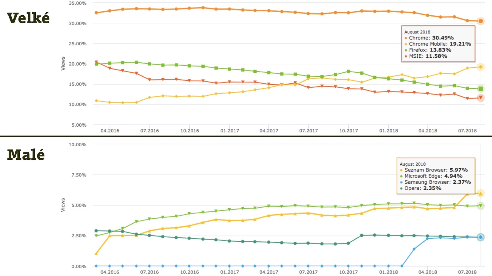 Trendy podílu prohlížečů na českém trhu pro ty „velké“ (s větším podílem na trhu) i „malé“. Zdroj: Gemius mezi dubnem 2016 a srpnem 2018, ranking.gemius.com
