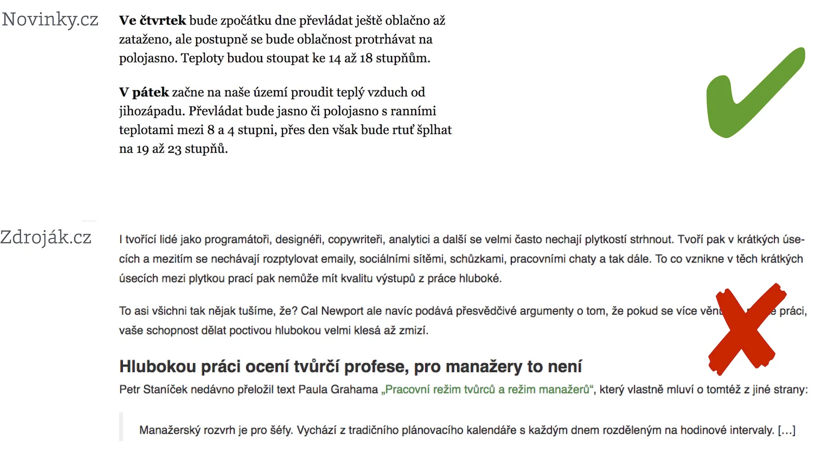 Novinky jsou nejen vysázené Georgií, patkovým písmem s vynikající čitelností pro delší texty, ale také velmi kontrastní barvou. Na českém webu jsou i výrazně horší weby než Zdroják, ale uvádím ho jako hůře čitelnou variantu díky kombinaci několika faktorů.