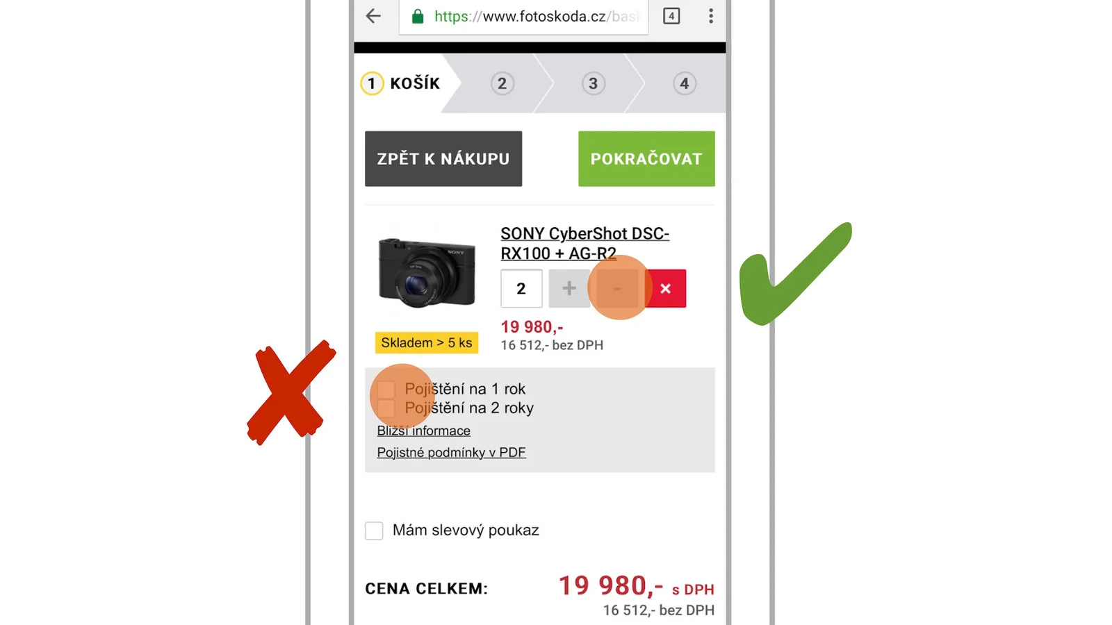 E-shop FotoŠkoda.cz má jeden z těch povedenějších košíků na mobilech. Všechno velké, navigace jednoznačná. Jen prvky v šedivé ploše s „Pojištěním“ by můj palec ani na pětiapůlpalcovém iPhonu netrefil. Na výšku alespoň centimetr, prosím